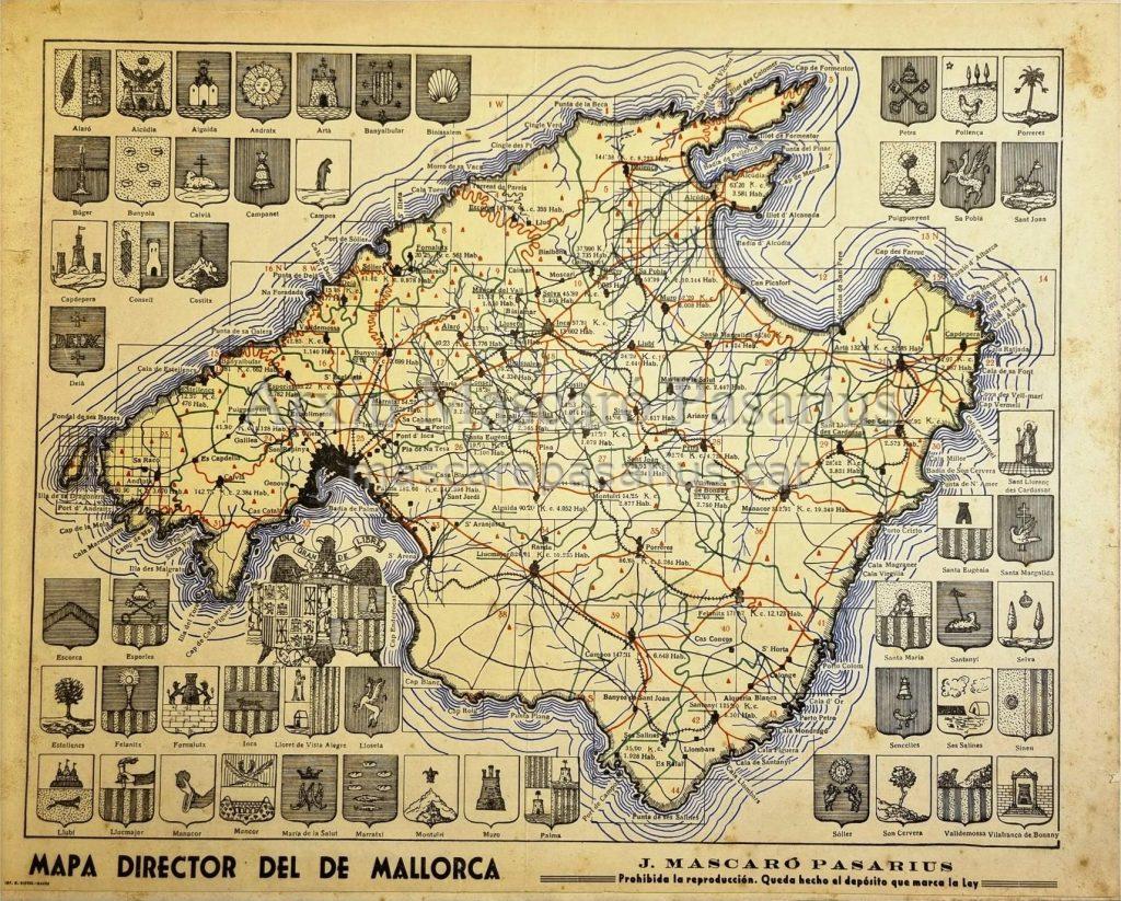 1 “Mapa director del de Mallorca”, en color, amb els escuts dels munjcipis en blanc i negre, imprès a la impremta M. Sintes de Maó.