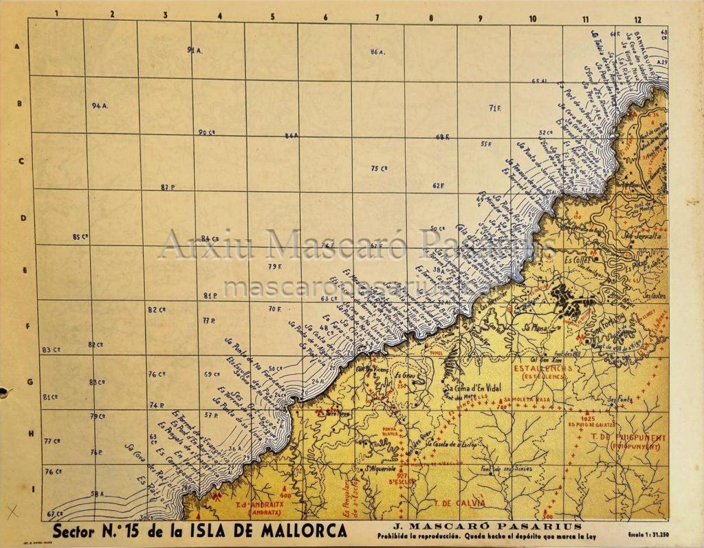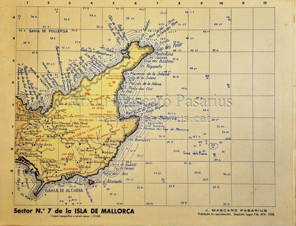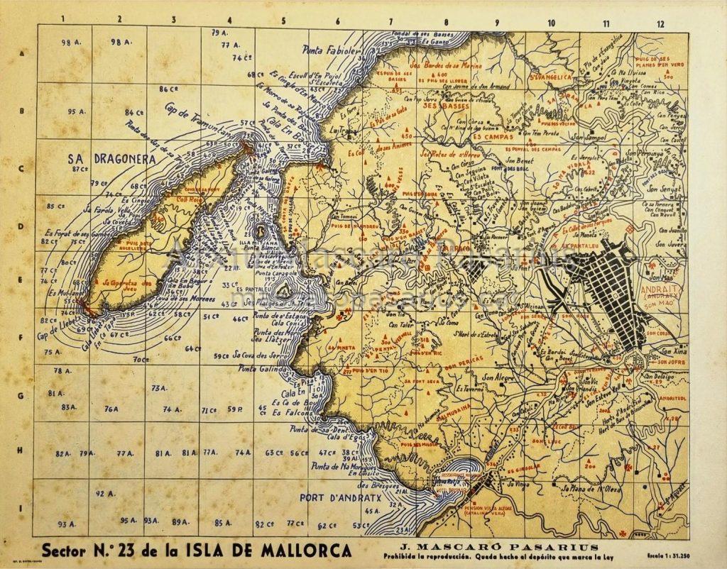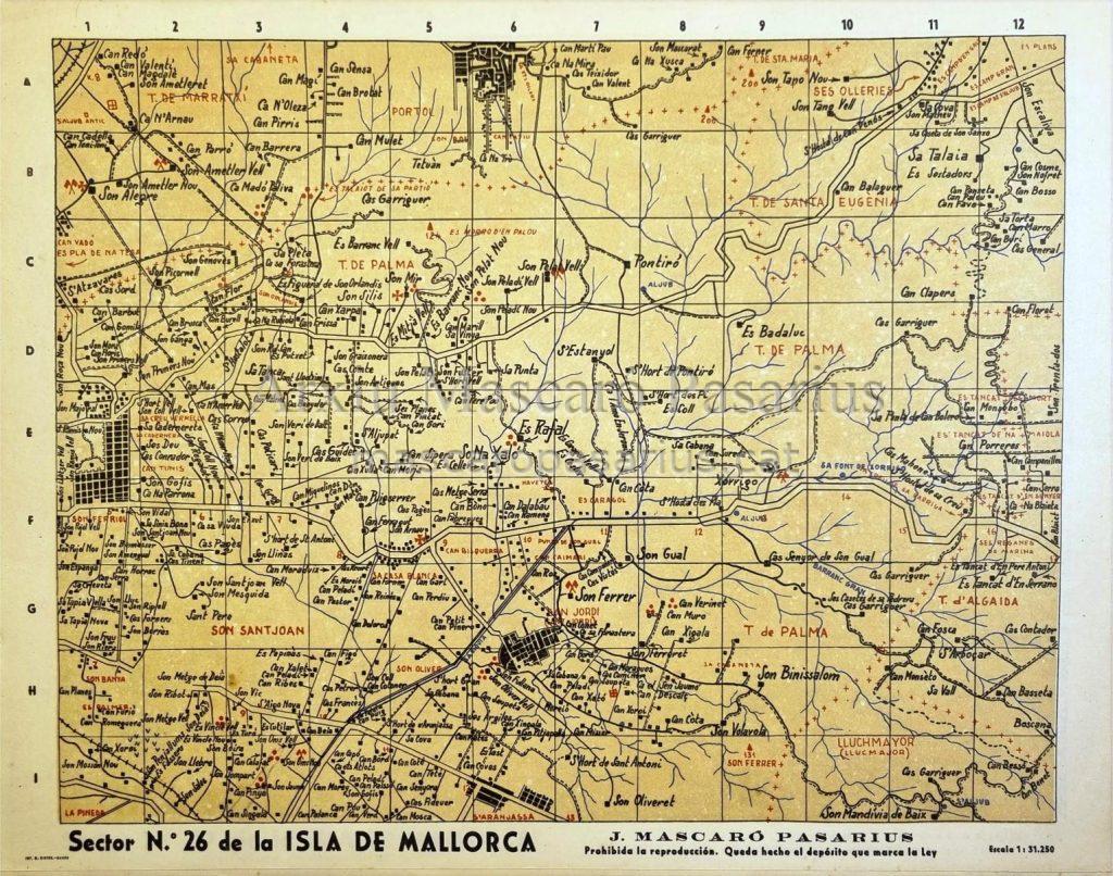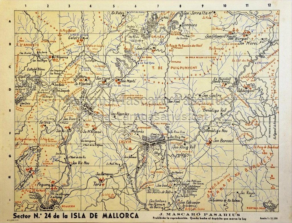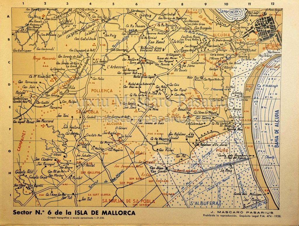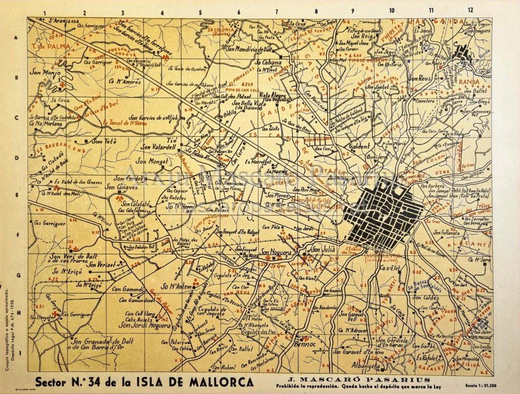 Mapa General de Mallorca.Croquis topográfico a escala aprox. 1:31.250 . [1ª ed.]. Mahón: [JMP], 1958 (Imprenta M. Sintes). 68 fulls de 31,5 x 43 cm, en color.