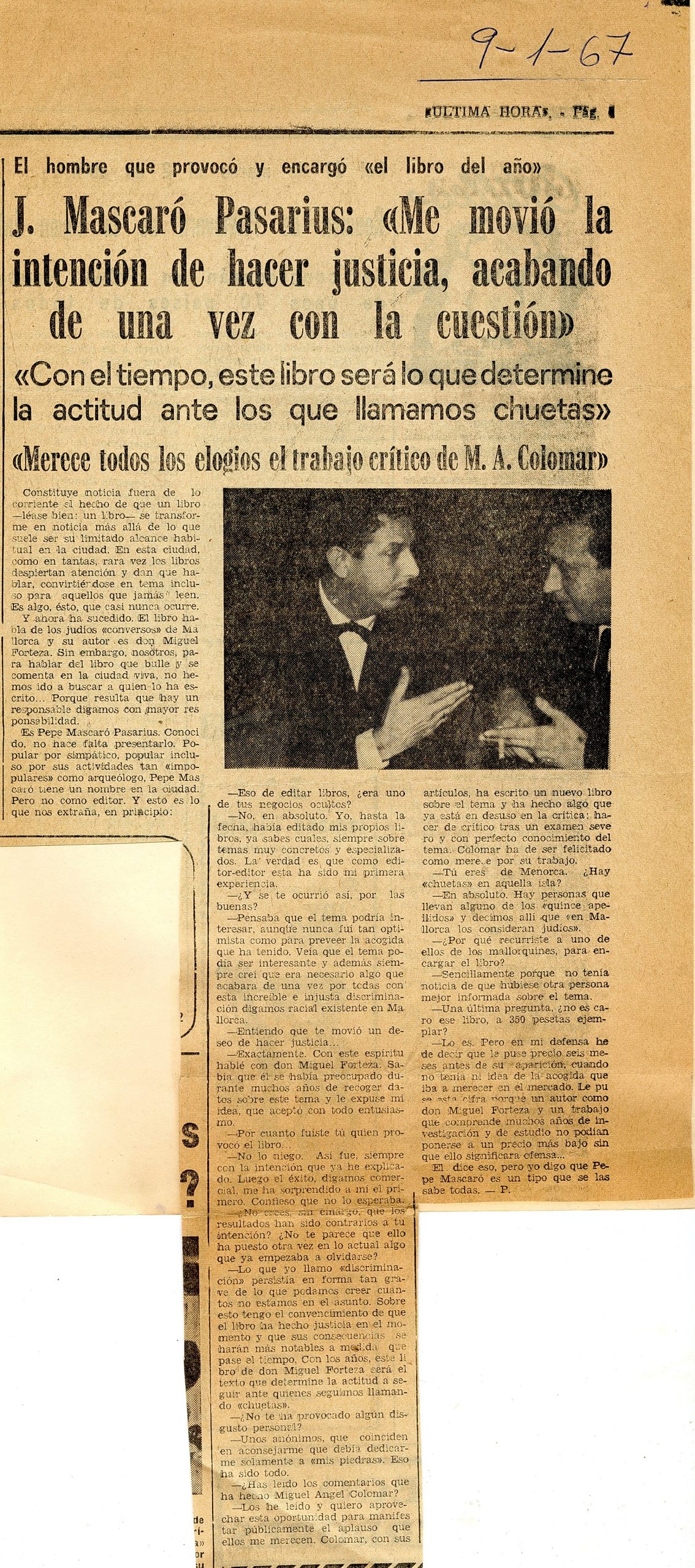 - J. Mascaró Pasarius: Me movió la intención de hacer justícia, acabando de una vez con la cuestión. Última Hora, 9-1-1967