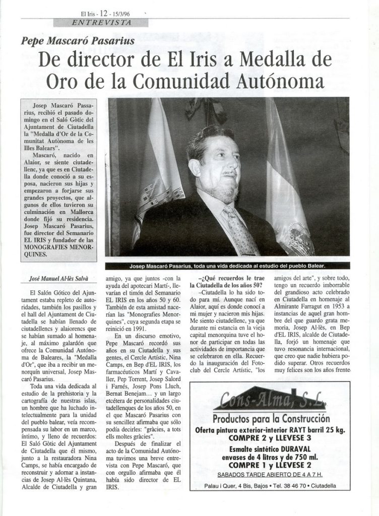 Entrevista. Pepe Mascaró Pasarius. De Director de El Iris a Medalla de Oro de la Comunidad Autónoma. El Iris, 15-3-1996 p. 12