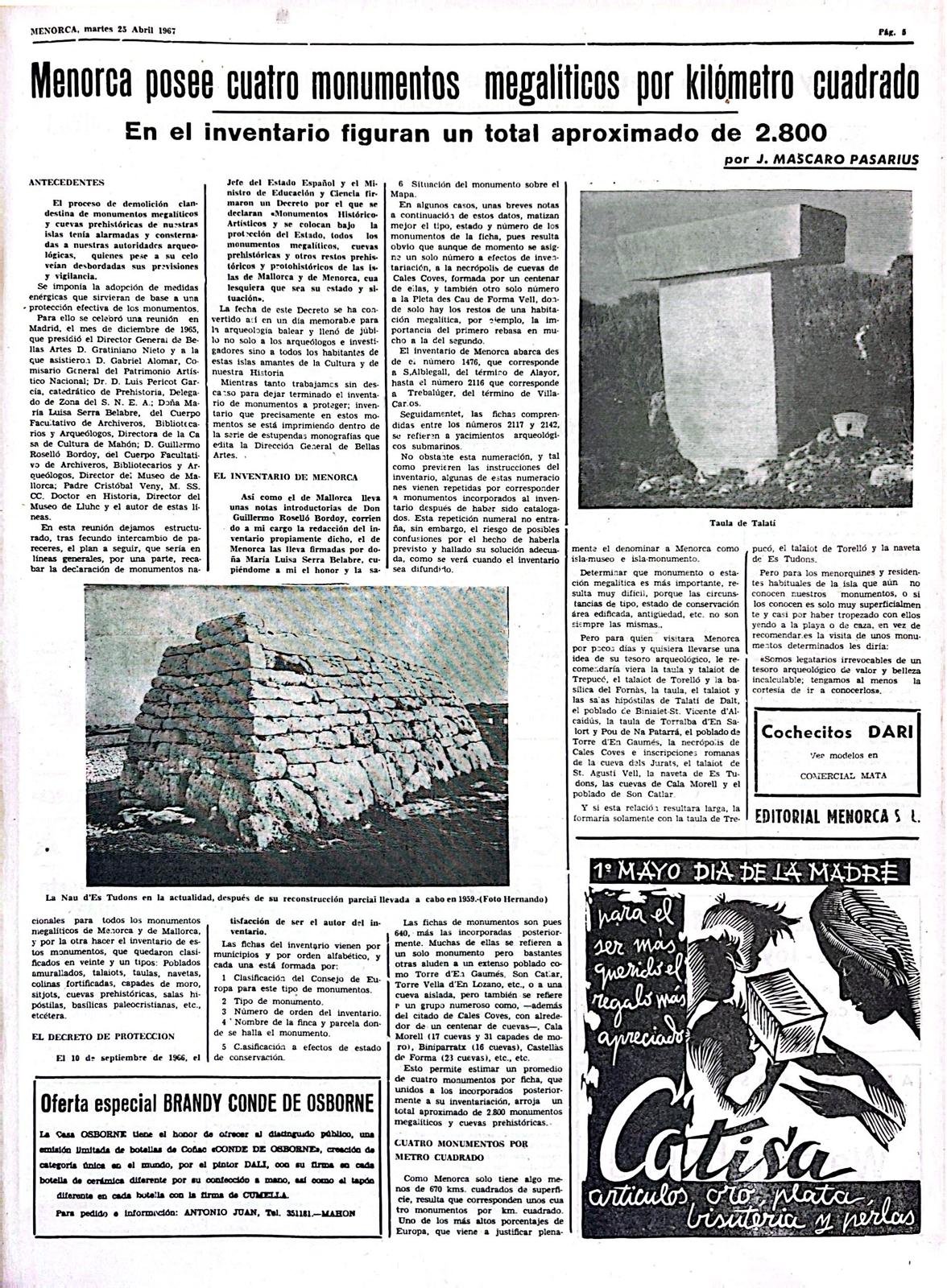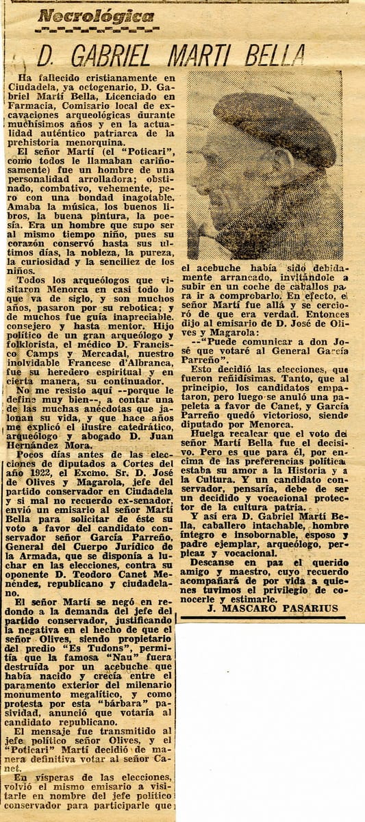 Dins la secció “Página menorquina” - [AP] Monumentos megalíticos del término de Mahón / J. Mascaró Pasarius. – En: Menorca, 4-10-1952, p. 2