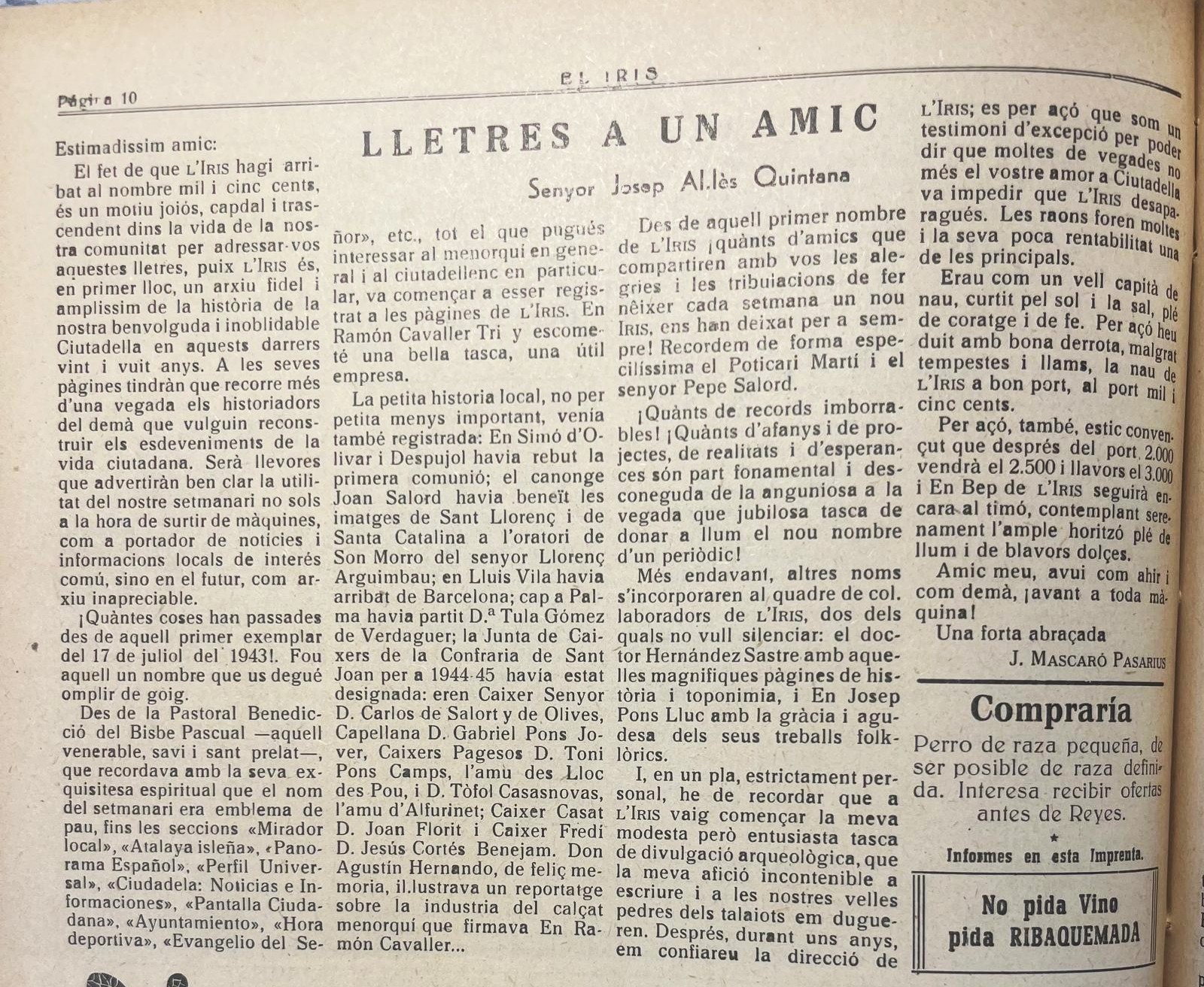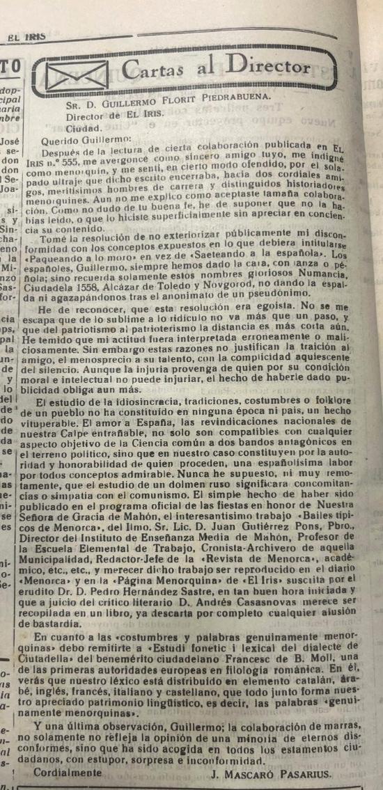 - [N] Aviso a los Sres suscriptores del Mapa de Menorca / J. Mascaró Pasarius. – En: El Iris, 24-05-1952, p. 3