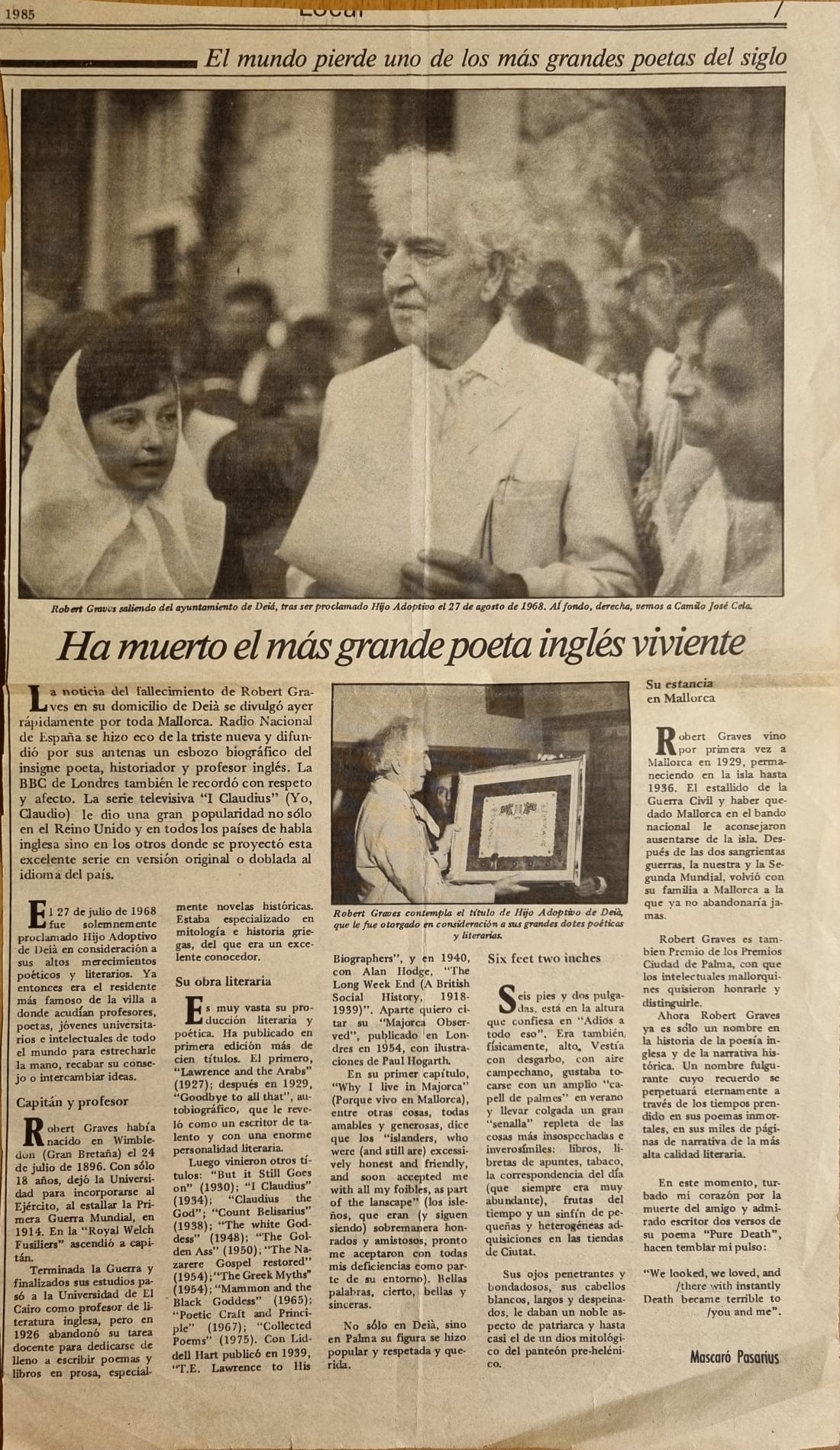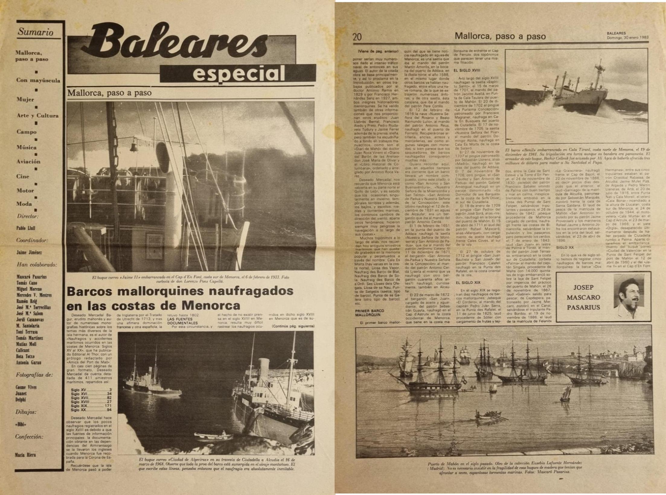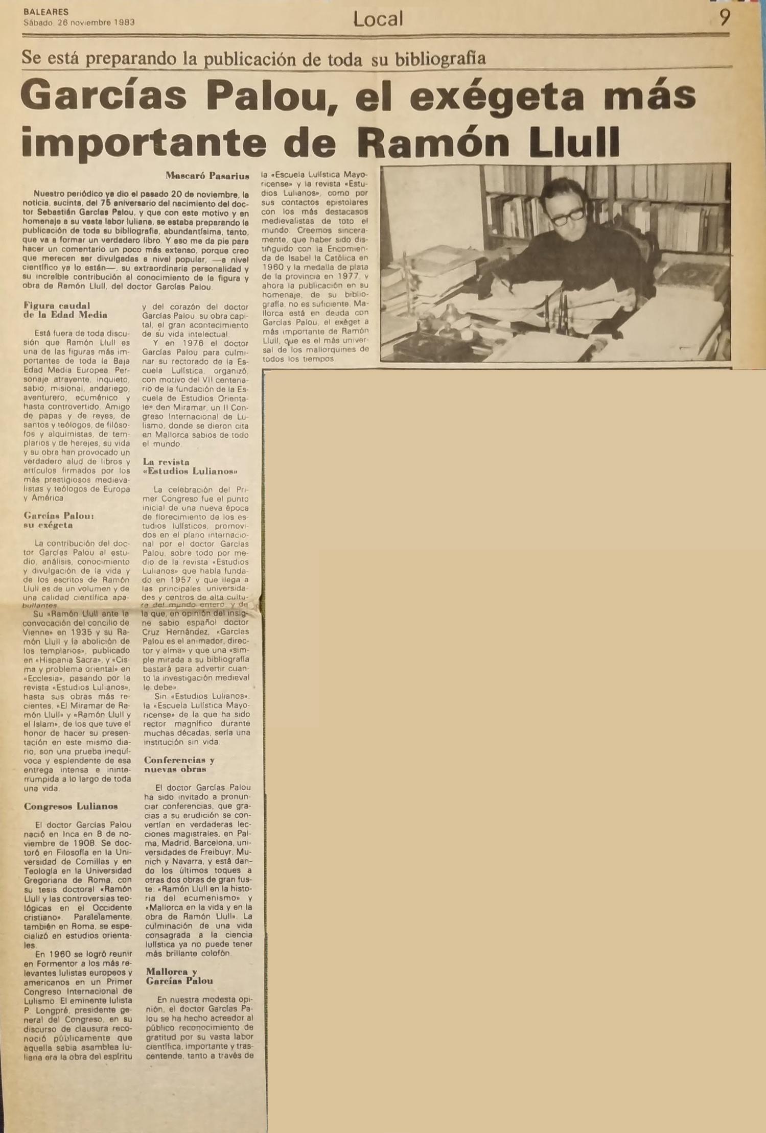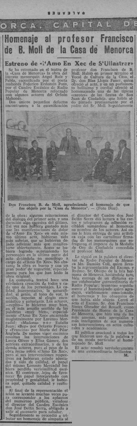 - [AP] Cuando evocar es volver a vivir / José Mascaró Pasarius. – En: Menorca, 15-11-45, p. 2