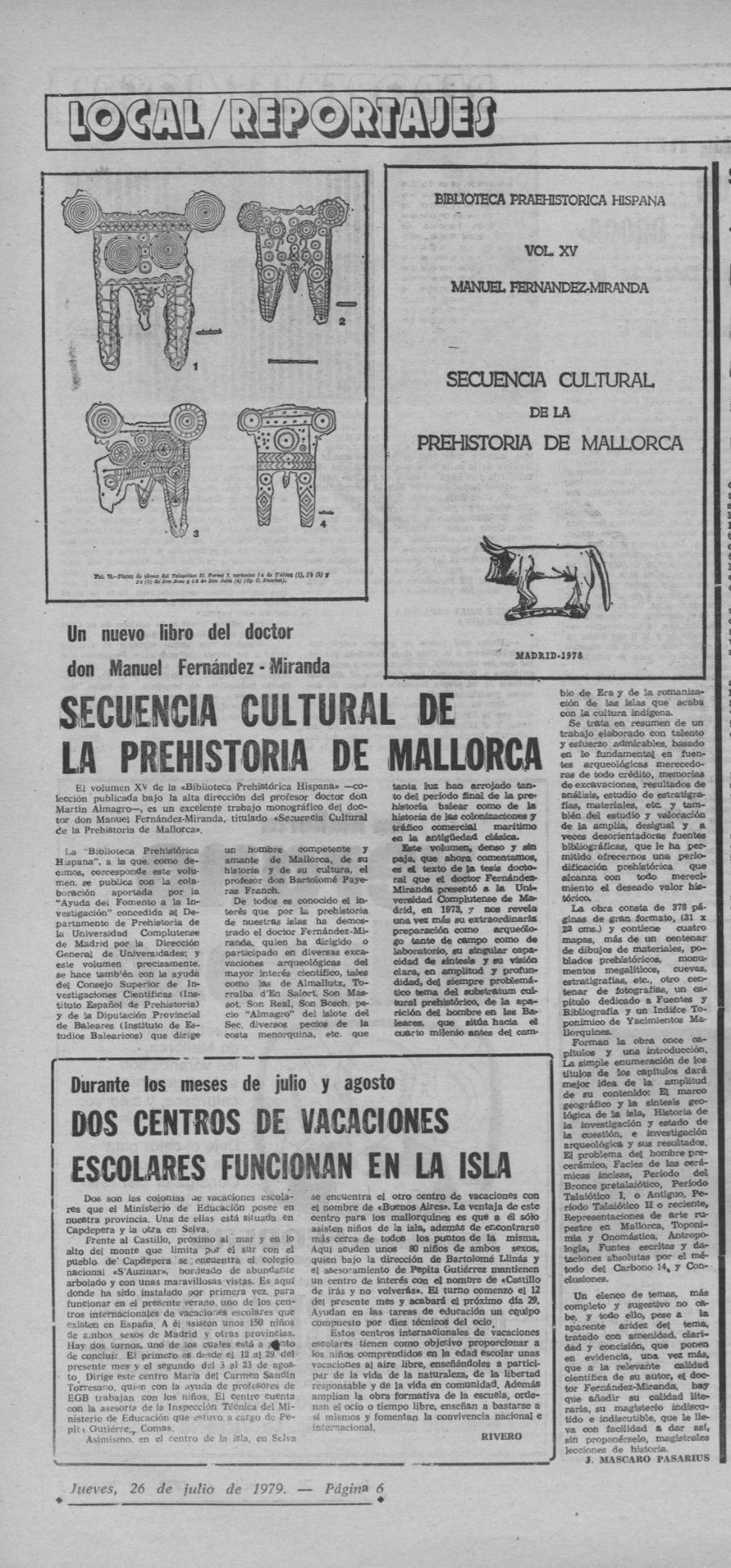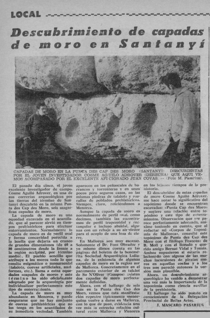 - [AP] Notas arqueológicas : extracto de un capítulo del libro en preparación: Catálogo de monumentos megalíticos de Menorca / José Mascaró Pasarius. – En: Menorca, 18-08-1952, p. 2.