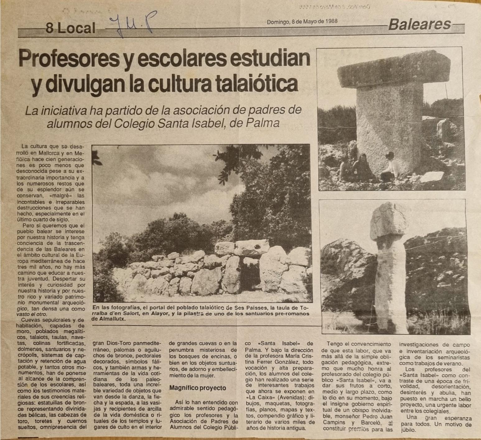 - [AP] Profesores y escolares estudian y divulgan la cultura talaiótica : la iniciativa ha partido de la asociación de padres de alumnos del Colegio Santa Isabel, de Palma / [JMP]. – En: Baleares, 8-05-1988, p. 8 : il.