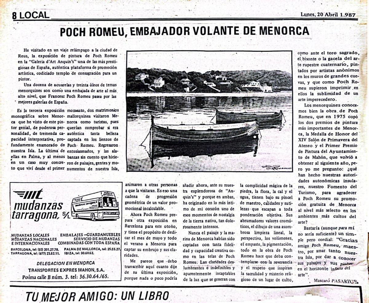 - Paràgraf de la presentació de l’exposició del pintor a The Anchorage Club, del 20 al 28-09-1986.