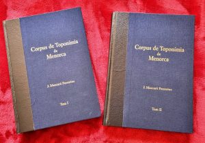 Corpus de toponímia de Menorca : distribució geogràfica dels topònims pre-romans, llatins, mossàrabs, àrabs i catalans. Palma : Hora Nova, 2005, 2 vol. (vol. I 352 pàgs., vol. 2 327 pàgs.). ISBN 84-96078-05-1 (o. c.)