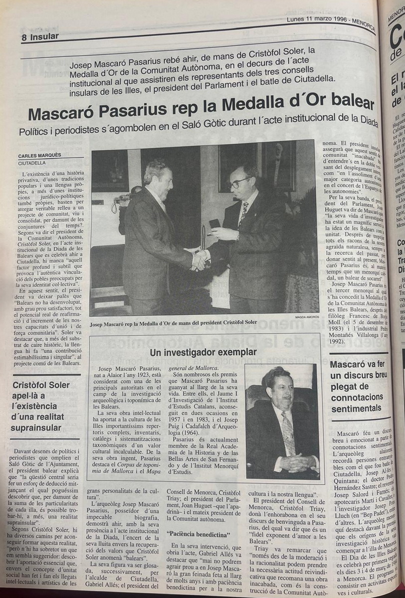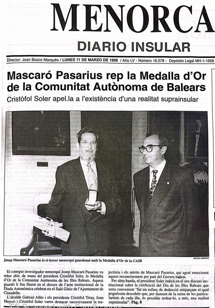 Mascaró Pasarius rep la Medalla d’Or balear. Menorca, 11-3-1996