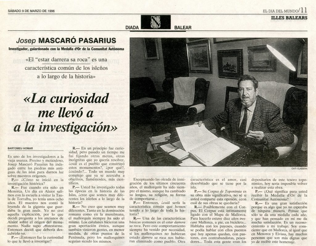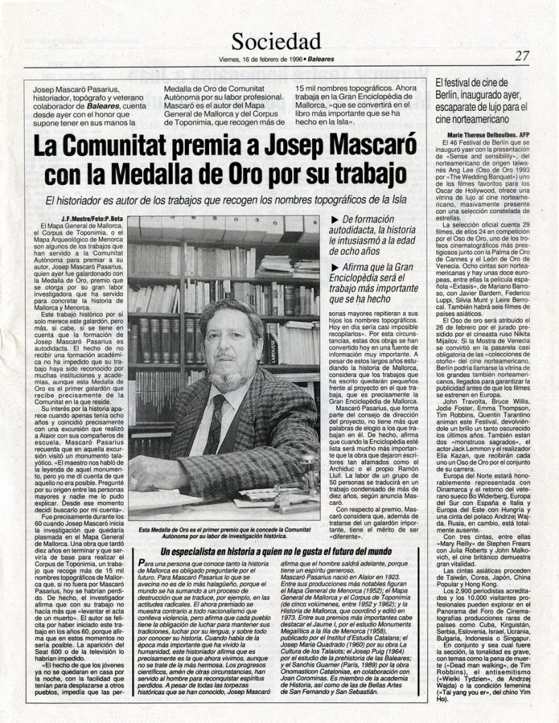 La comunidad premia a Josep Mascaró Pasarius con la Medalla de Oro por su trabajo. Baleares, 16-2-1996 p. 27