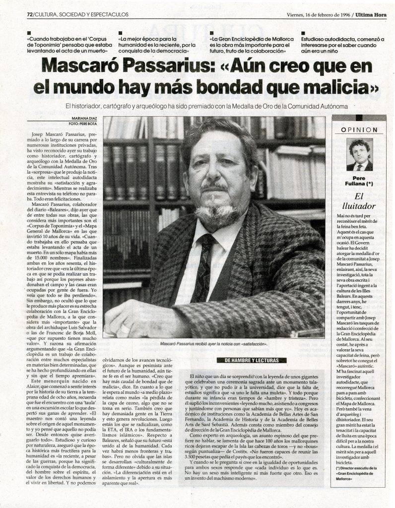 La comunidad premia a Josep Mascaró Pasarius con la Medalla de Oro por su trabajo. Baleares, 16-2-1996 p. 72