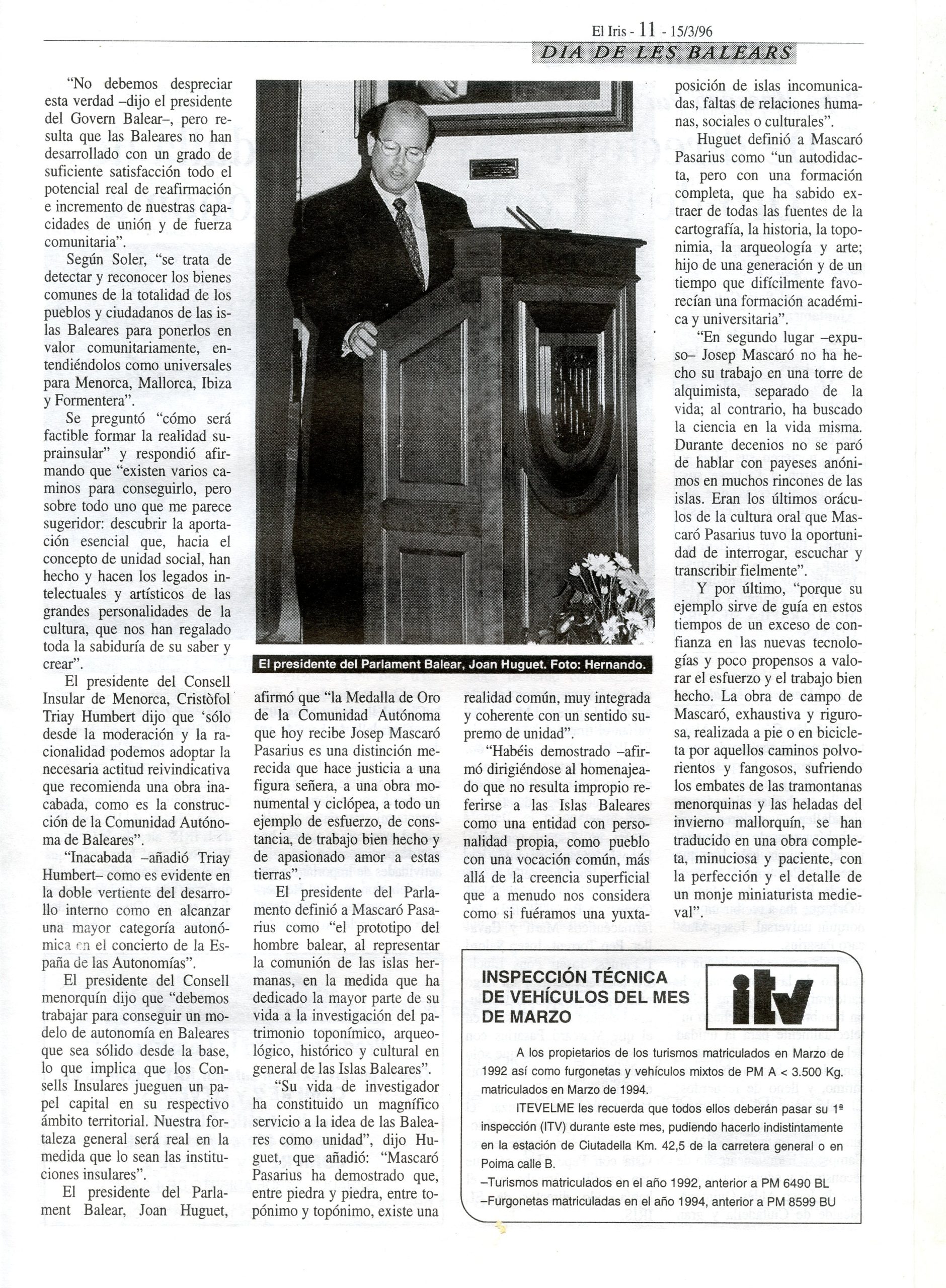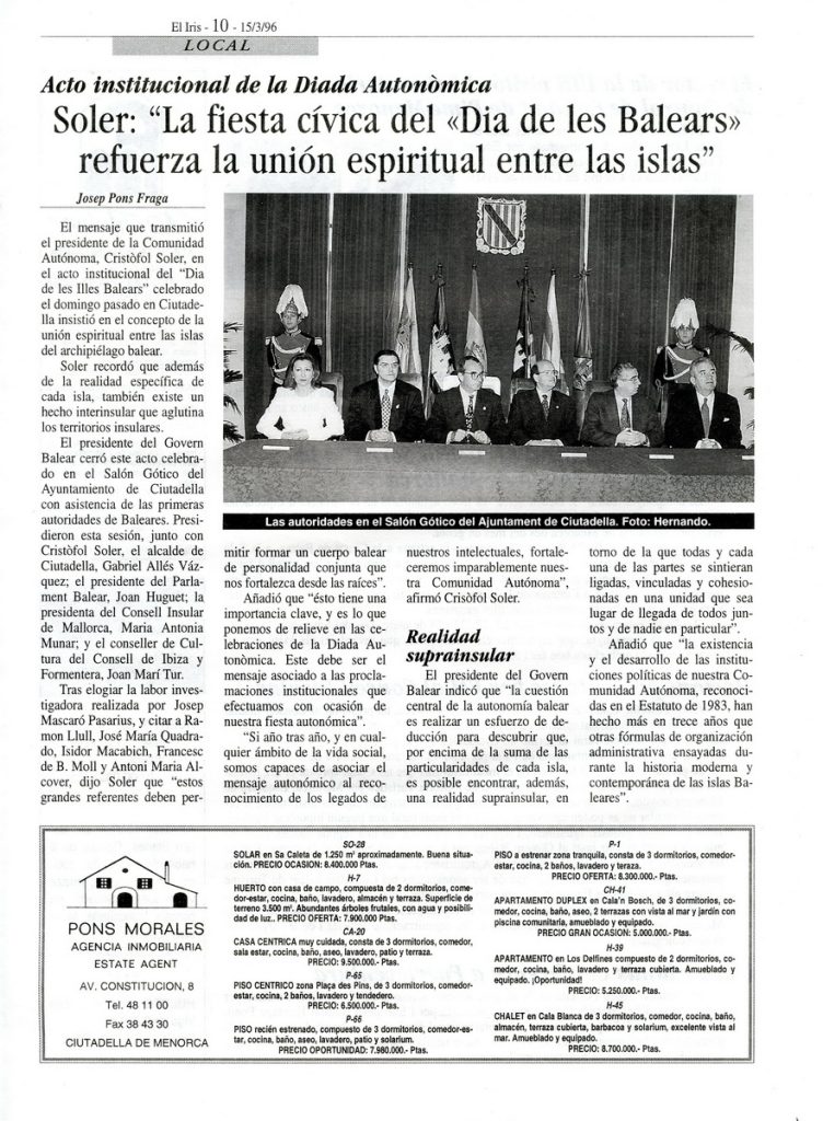 Soler: la fiesta cívica del “Dia de les Balears” refuerza la unión espiritual entre las islas. El Iris, 15-3-1996 p. 11