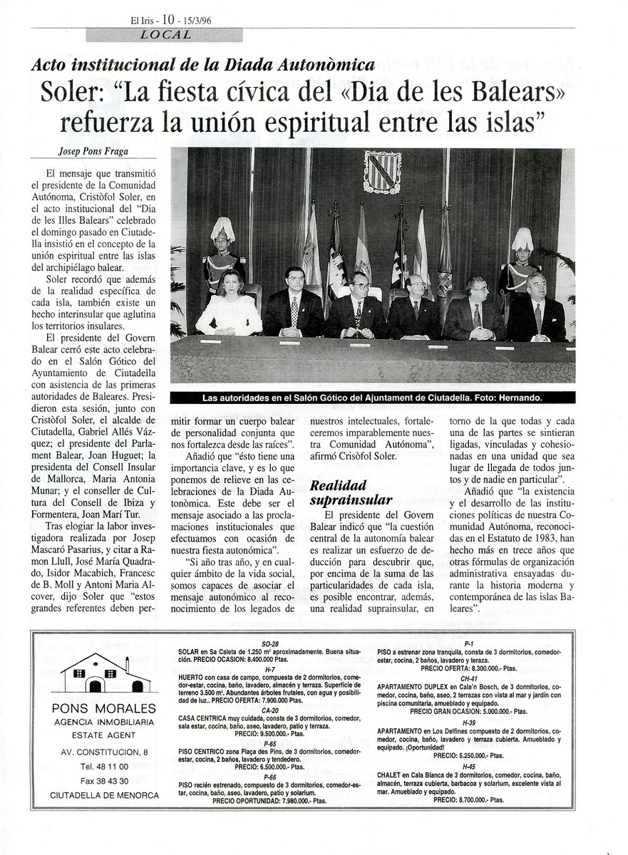 Soler: la fiesta cívica del Dia de les Balears refuerza la unión espiritual entre las islas. El Iris, 15-3-1996 p. 10