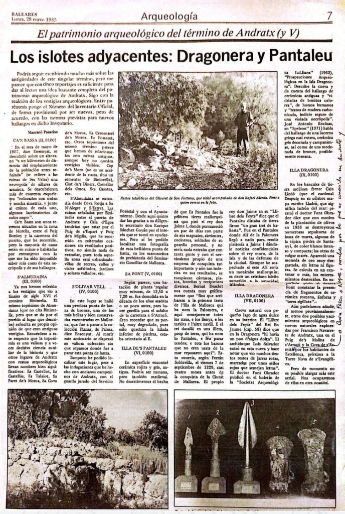 El patrimonio arqueológico del término de Andratx (y V). Los islotes adyacentes: Dragonera y Pantaleu. Diario Baleares, 28-1-1985