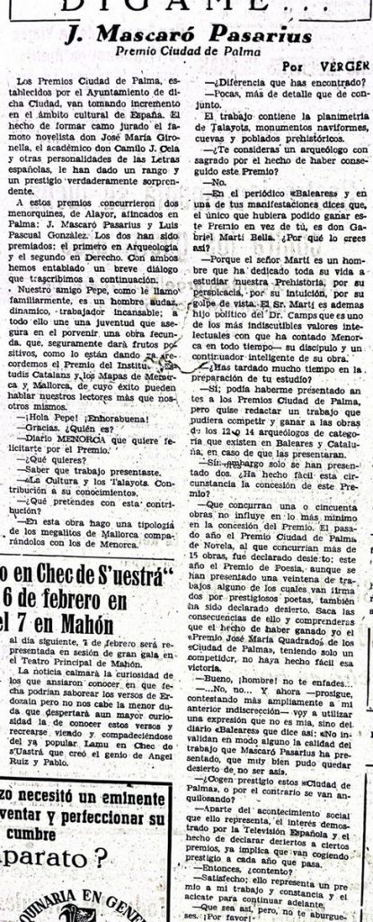 Entrevista de Verger pel Premi Ciutat de Palma. D. Menorca, 23-1-1961