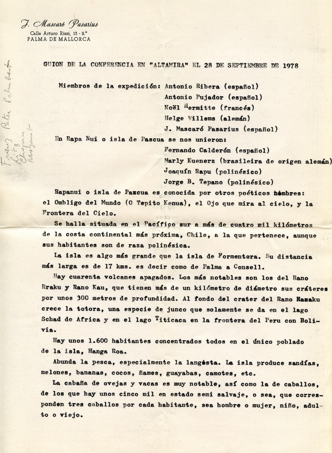 Guió de la conferència Las grandes incógnitas de las Islas del Pacífico Sur, p. 1 a l’Asociación Hispano Alemana “Altamira”, 28-10-1978