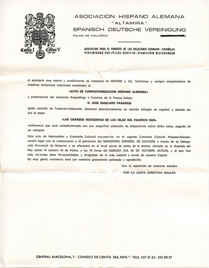 Invitació a la conferència Las grandes incógnitas de las islas del Pacífico Sur, a l’Asociación Hispano Alemana “Altamira”, en la Delegació provincial de Cultura de Balears, 28-10-1978
