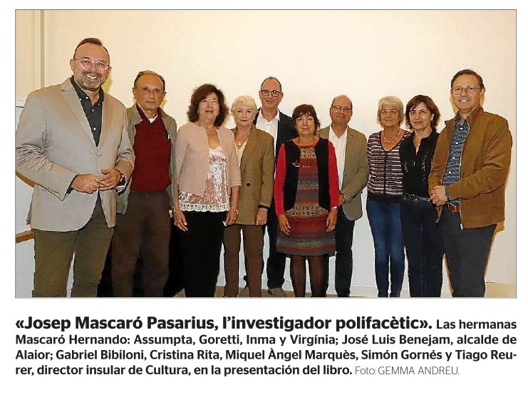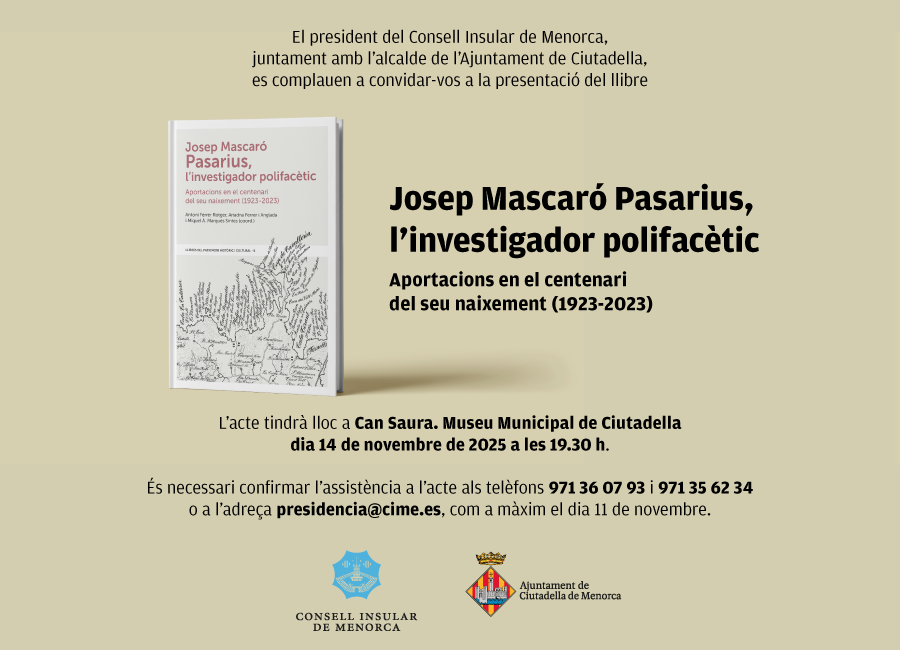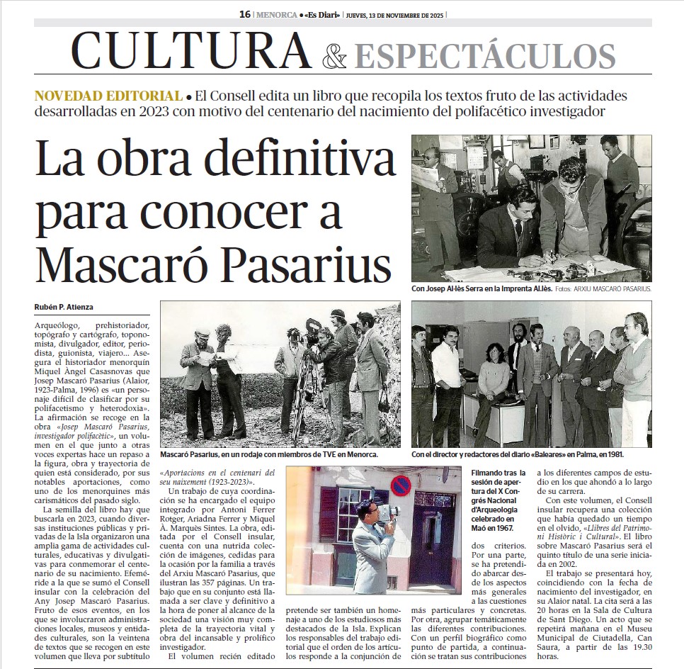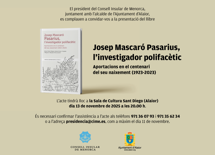 Presentació del llibre Josep Mascaró Pasarius, l’investigador polifacètic. Aportacions en el centenari del seu naixement (1923-2023). Sala de cultura Sant Diego (Alaior). Es Diari.Menorca, 14-11-2025