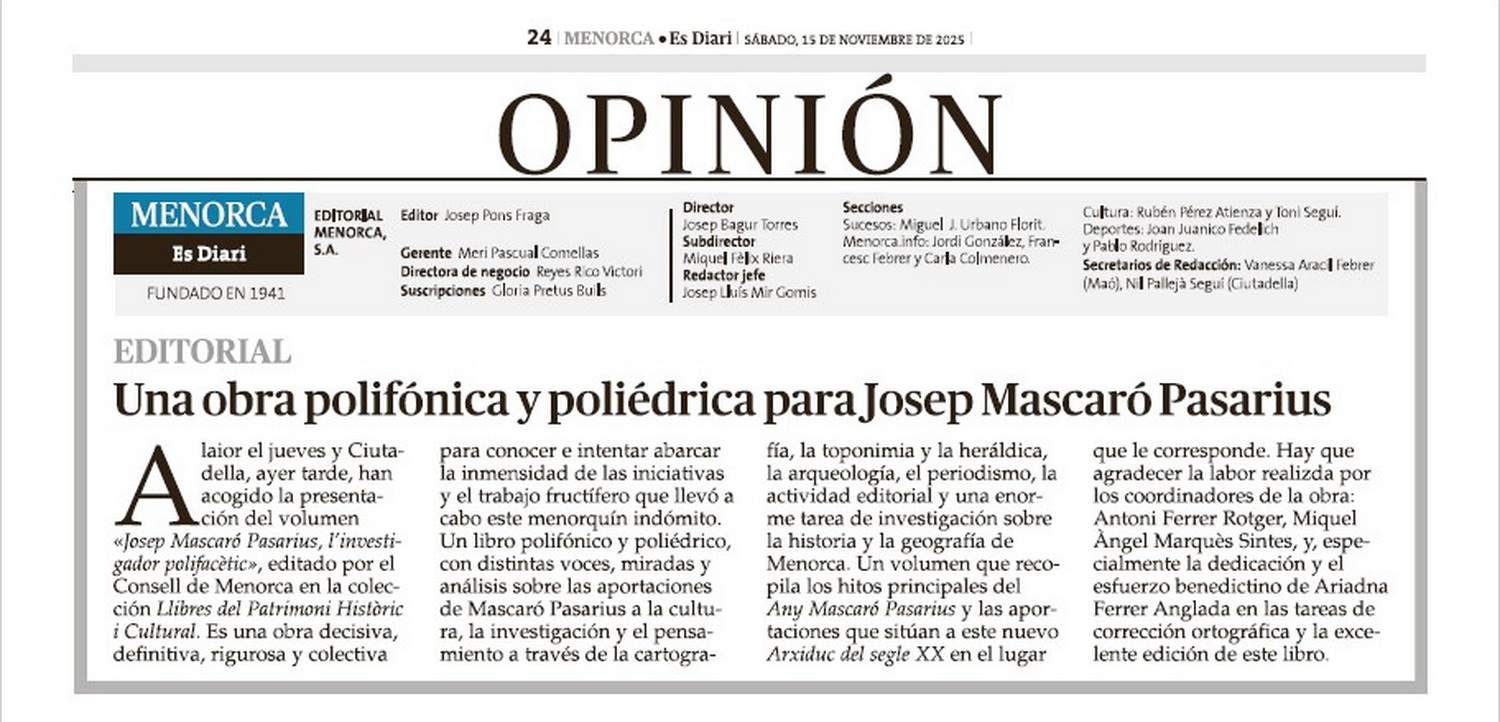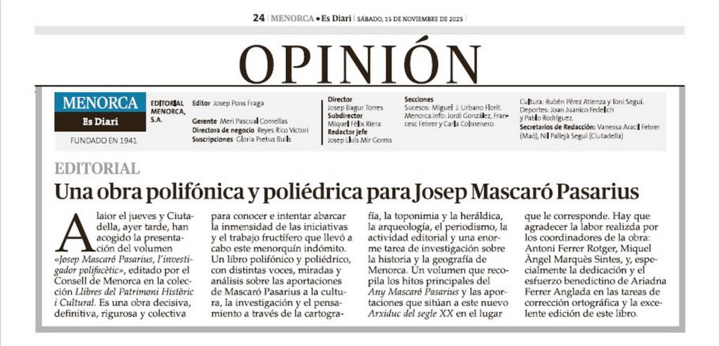 Editorial “Una obra polifónica y poliédrica para Josep Mascaró Pasarius”. Menorca.Es Diari, 15-11-2025